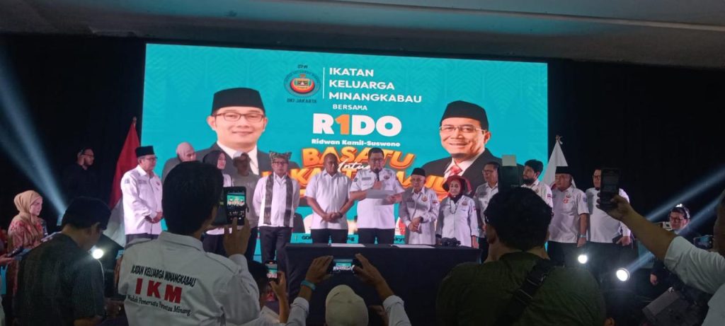 Jakarta – Deklarasi dukungan Ikatan Keluarga Minangkabau (IKM) kepada Pasangan Calon (Paslon) Gubernur dan Wakil Gubernur Jakarta nomor Urut 1, Ridwan Kamil-Suswono (R1DO), berlangsung meriah, Senin (18/11/2024) malam di GOR Pulo Gadung, Jakarta Timur (Jaktim). Deklarasi ini dipimpin oleh Ketua DPW IKM Jakarta, Braditi Moulevey Rajo Mudo serta dihadiri oleh perwakilan IKM se-Jakarta mulai dari DPP, DPW, DPD, hingga DPC. Ridwan Kamil turut hadir secara langsung menerima dukungan dari komunitas Minangkabau yang solid mendukung kemenangan R1DO dalam satu putaran. Doa bersama dipanjatkan agar R1DO menang dalam Pilgub Jakarta 2024 satu putaran. Suasana semakin semarak dengan sambutan pantun yang saling bersahutan dari H Andre Rosiadie Ketua Harian IKM, Braditi Mouleveh Rajo Mudo Ketua DPW IKM, hingga pantun khas Ridwan Kamil yang memukau hadirin. Turut hadir pula Ketua Harian DPP IKM, H Andre Rosiade, yang juga Anggota DPR RI Komisi VI. Kegiatan deklarasi semakin meriah dengan hiburan dari artis Ibu Kota dan pembagian berbagai hadiah menarik, menambah semangat para peserta deklarasi. “Bersama IKM, mari kita menangkan R1DO untuk Jakarta yang lebih baik,” katanya. Braditi Moulevey Rajo Mudo membenarkan bahwa persatuan perantau Minang yang berada di dalam organisasi itu menjatuhkan pilihannya kepada pasangan nomor urut 1, Ridwan Kamil-Suswono (RIDO). “Dukungan ini kami berikan setelah mendengarkan aspirasi dari seluruh pengurus di tingkat Dewan Pimpinan Daerah (DPD) IKM Jakarta. Mereka menginginkan bahwa di Pilkada Jakarta, dukungan diberikan kepada Ridwan Kamil dan Suswono,” katanya. Dukungan yang diberikan IKM Jakarta kepada Ridwan Kamil dan Suswono, kata Moulevey bukan tanpa alasan. “Beberapa alasan IKM Jakarta mendukung R1DO adalah, di mana kita sebagai orang Minang itu tentu melihat bagaimana ketokohan seseorang, baik dari sisi religiusitas, keagamaan, latar belakang pendidikannya dan pengalaman dalam hal pemerintahan,” katanya. IKM Jakarta, kata Moulevey yang berasal dari Padang itu berharap Ridwan Kamil dan Suswono bisa lebih memperhatikan lagi warga Jakarta yang berasal dari Sumatera Barat (Sumbar) atau Minangkabau. “Mudah-mudahan dengan kepemimpinan pasangan R1DO, tentu akan lebih baik untuk pembangunan Jakarta, bisa lebih maju,” katanya. “Jakarta sebagai etalase Indonesia yang dihuni berbagai banyak suku, tentunya pasangan RIDO diyakini bisa menjaga keharmonisan warga yang berasal dari berbagai suku tersebut,” pungkasnya. (*)